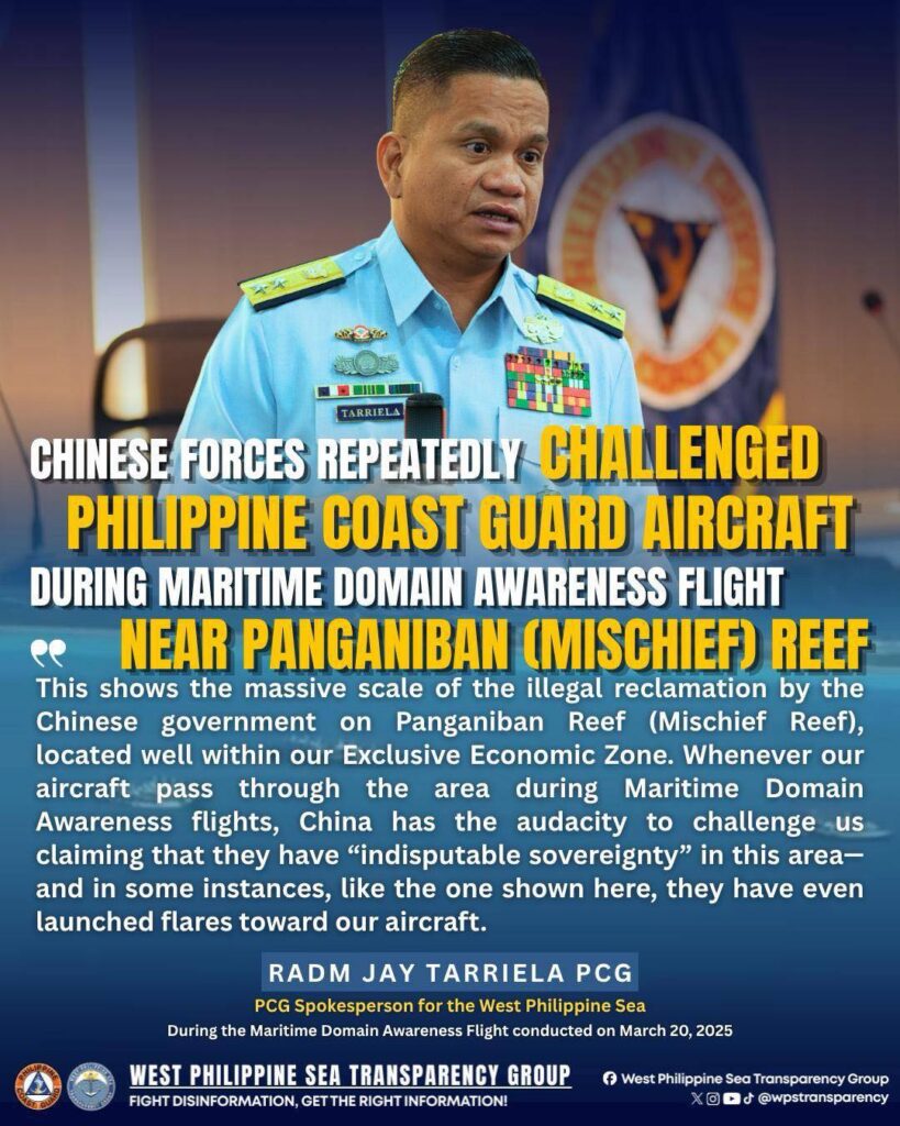 A ๐๐ก๐ข๐ฅ๐ข๐ฉ๐ฉ๐ข๐ง๐ ๐๐จ๐๐ฌ๐ญ ๐๐ฎ๐๐ซ๐ aircraft was ๐๐ก๐๐ฅ๐ฅ๐๐ง๐ ๐๐ while flying near the ๐๐๐ง๐ ๐๐ง๐ข๐๐๐ง (๐๐ข๐ฌ๐๐ก๐ข๐๐) ๐๐๐๐ in the West Philippine Sea. People stationed on the artificial island fired flares and repeatedly sent radio warnings to the plane, although its flying within the Philippinesโ own ๐๐ฑ๐๐ฅ๐ฎ๐ฌ๐ข๐ฏ๐ ๐๐๐จ๐ง๐จ๐ฆ๐ข๐ ๐๐จ๐ง๐ near ๐๐๐ฅ๐๐ฐ๐๐ง.