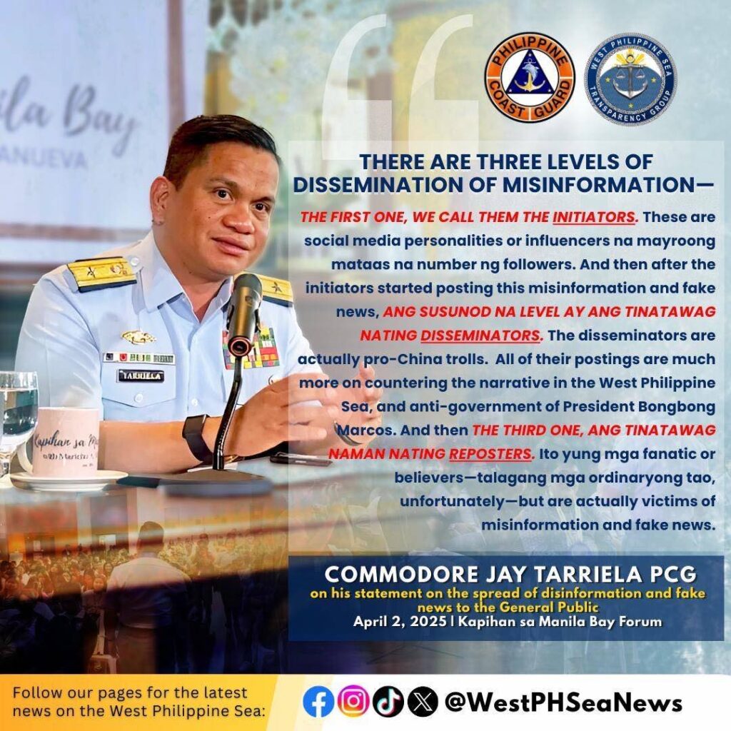 During the Kapihan sa Manila Bay Forum on April 2, 2025, Commodore Jay Tarriela, PCG Spokesperson for the West Philippine Sea,Β addressed the growing concern of misinformation and fake news, particularly in relation to national security and maritime issues. He explained that misinformation spreads through three levels: π°πππππππππ, π«ππππππππππππ, πππ πΉππππππππ.