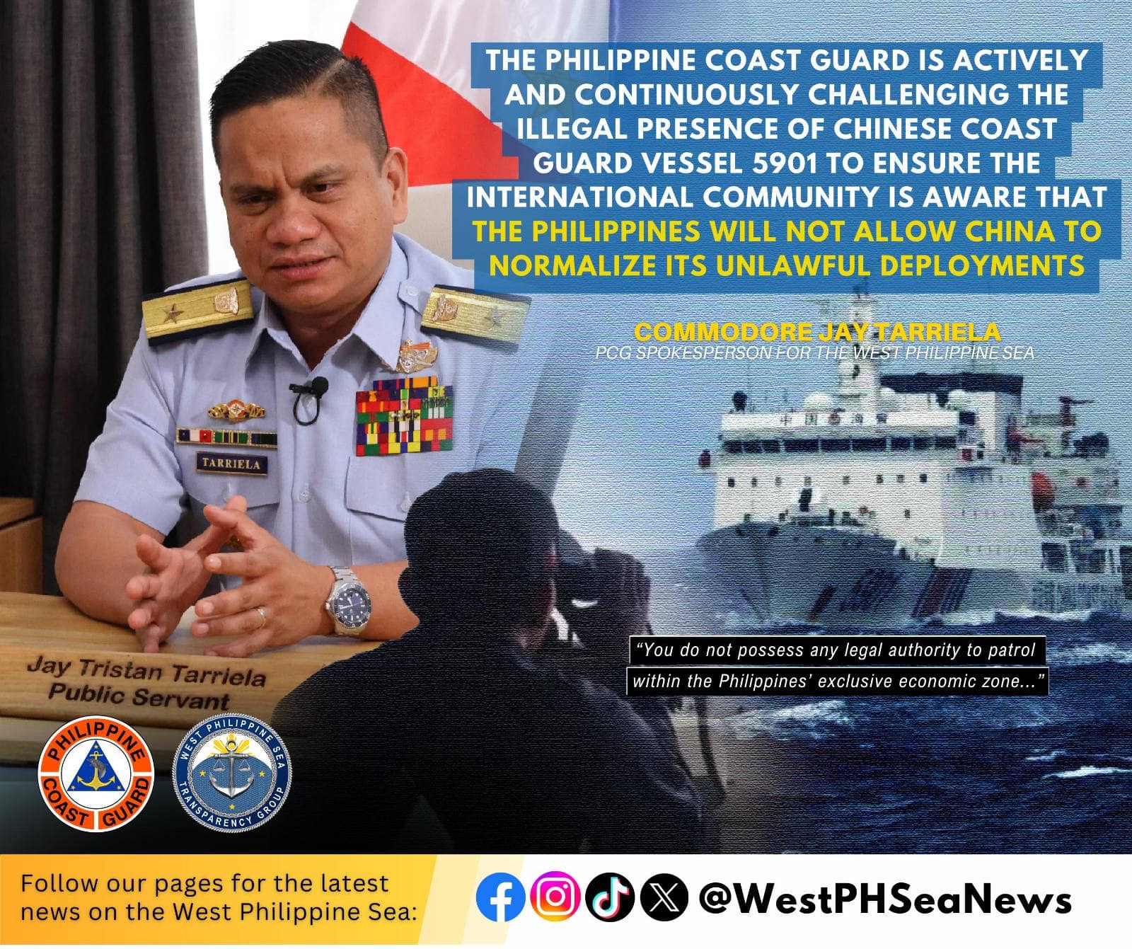 The Philippine Coast Guard is boldly and proudly pushing back against any attempt to legitimize illegal actions in the West Philippine Sea. By challenging the presence of Chinese Coast Guard Vessel 5901, the PCG makes it clear: the normalization of unlawful deployments will never be accepted. They have no right to operate within our waters, and the Philippines will firmly oppose any activity that undermines its rightful interests.